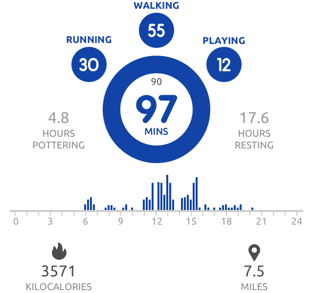 You can see all the details of your dog's activity on a particular day by tapping on the appropriate blue bar in the history to open the Activity Day View.